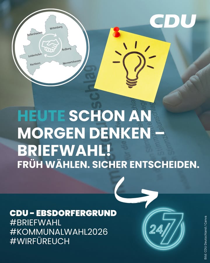 mehr🗳 Heute startet die Briefwahl!Demokratie funktioniert nicht nur am Wahltag ?sie beginnt genau jetzt. ✉️Wer am Wahltag keine Zeit hat oder einfach früh Klarheit schaffen möchte, kann ab sofort per Briefwahl abstimmen ? unkompliziert, sicher und bequem von zu Hause aus.👉 Die Briefwahlunterlagen gibt?s📍 beim Wahlamt der Gemeinde💻 online, 📬 per Post oder persönlichAlle Informationen dazu, erhälst du auch auf der Homepage der Gemeinde Ebdorfergrund.Mit deiner Stimme entscheidest du mit,wie sich unsere Gemeinde und unser Landkreis weiterentwickeln sollen.Die CDU Ebsdorfergrund steht für Verantwortung, Verlässlichkeit und Politik mit Bodenhaftung ? nah bei den Menschen, klar in der Sache.💡 Unser Tipp:Jetzt beantragen, in Ruhe entscheiden ? und sicherstellen, dass deine Stimme zählt.🖊️ Demokratie lebt vom Mitmachen.Mach den ersten Schritt ? ab heute Briefwahlunterlagen beantragen.#Briefwahl #DemokratieLeben #CDUEbsdorfergrund #DeineStimmeZählt #Kommunalpolitik #wählengehen