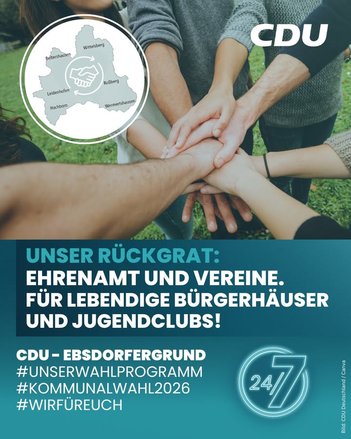 mehrAus unserem Wahlprogramm heute:💪 Vereine und Ehrenamt ? Rückgrat unseres Gemeinwesens ❤Vereine und ehrenamtliches Engagement sind das Rückgrat unseres Gemeinwesens. Besonders die Jugend- und Nachwuchsarbeit in unseren Vereinen ist unverzichtbar.🏡 Unsere lebendige Vereinslandschaft wird weiterhin besonders unterstützt.Wir möchten die Nutzung von Bürgerhäusern für Vereine deutlich vereinfachen.🎶 Musik- und Kulturangebote wollen wir besser koordinieren und gemeinsam mit Vereinen und Ehrenamtlichen weiterentwickeln ? zum Beispiel im Rahmen einer ehrenamtlichen Musikschule in unseren Bürgerhäusern.👫 Ein Jugendclub in jedem Ortsteil ? entweder neu oder durch gezielte Förderung bestehender Clubs.💰 Die Preise für Bürgerhäuser sollen vereinheitlicht und für Bürgerinnen und Bürger unserer Gemeinde Vergünstigungen geschaffen werden. Gemeinderäume müssen für alle bezahlbar bleiben.🤝 Wir wollen ein ehrenamtliches "Kümmerer-Modell" als zentrale Anlaufstelle für die Ortsteile im Ebsdorfergrund einführen. Ziel: Entlastung der Verwaltung, kurze Wege, Bürgerlicher Ansprechpartner und bessere Koordination zwischen Bürgern, Ehrenamt und Verwaltung. Ein Schwerpunkt liegt auf dem aktiven Umgang mit Leerstand.👉 am 15.03.2026 CDU - Ebsdorfergrund wählen!#Vereine #Ehrenamt #Jugendförderung #CDUEbsdorfergrund #Bürgerhäuser #Musikschule #Kultur #Jugendclub #Gemeinschaft #Zusammenhalt #EhrenamtStärken #BezahlbarFürAlle