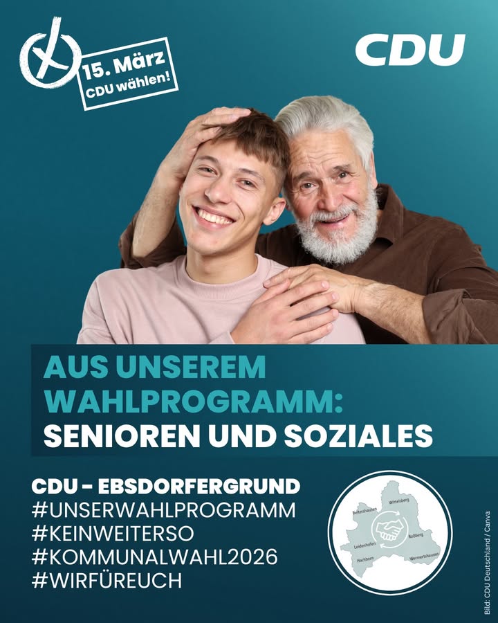 mehr📰 Aus unserem Wahlprogramm heute:👉 Senioren und Soziales ? Teilhabe am gesellschaftlichen Leben ☑Wir setzen uns ein für Seniorinnen und Senioren, damit sie möglichst lange selbständig in ihren Ortsteilen leben können. 🏡Die Bürgerhilfe ist ein wichtiger Pfeiler für Mobilität und Gemeinschaft älterer Mitbürger im Ebsdorfergrund. 🚶♂️🚶♀️ Die Gemeinde soll ihre Arbeit weiter unterstützen und fördern. 🤝Wir möchten die Rahmenbedingungen für die Teilnahme am gesellschaftlichen Leben verbessern. Der GrundTreff muss dauerhaft erhalten bleiben. ❌💸Wir lehnen daher die pauschalen Haushaltskürzungen ab, die die Angebote des GrundTreffs gefährden würden.💡 Neues Konzept: GrundTreff-to-goDer GrundTreff soll mobil werden und wechselnd in den bestehenden Bürgerhäusern stattfinden. So erhalten auch weniger mobile Bürgerinnen und Bürger die Möglichkeit, dabei zu sein. 🚌🏘️👉 am 15.03.2026 CDU - Ebsdorfergrund wählen!#Ebsdorfergrund #Senioren #GrundTreff #Mobilität #Gemeinschaft #Bürgerhilfe #CDU #Bürgernah #ZukunftGestalten #Ehrenamt #VerantwortungÜbernehmen #KeinWeiterSo #Kommunalwahl2026 #Ebsdorfergrund #UnsereHeimat #StarkeListe #FürUnsereGemeinde #Kommunalpolitik #PolitikVorOrt #NahBeiDenMenschen #ZuhörenAnpackenDranbleiben #GemeinsamStark #MitHerzUndVerantwortung #Zusammenhalt #ZukunftGestalten #CDUEbsdorfergrund