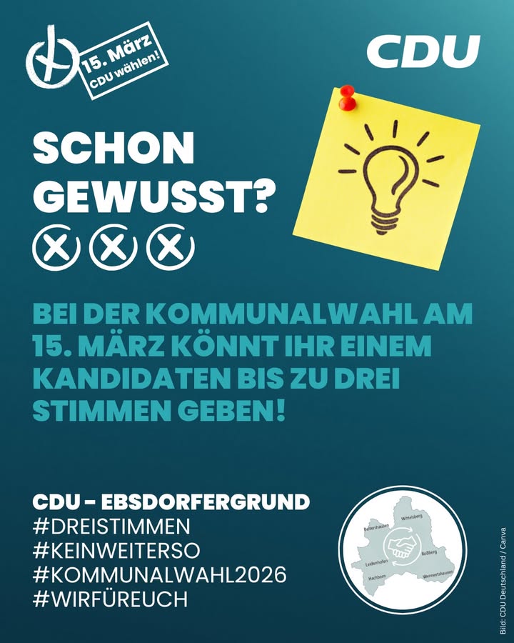 ‼️ Reden reicht nicht. Jetzt ist Zeit, Verantwortung zu übernehmen.Am 15. März ist Kommunalwahl ? und hier zählt Eure Stimme mehr, als viele denken. 🗳️👉 Wusstet Ihr schon?Bei der Kommunalwahl könnt Ihr einzelnen Kandidatinnen und Kandidaten bis zu drei Stimmen geben.👀 Viele kennen diese Möglichkeit nicht ? dabei macht sie oft den Unterschied!Nutzt Eure Stimmen gezielt für Menschen,🤝 die sich einsetzten,🏘 die sich engagieren,💪 die Verantwortung übernehmen wollen ? statt nur zu reden.Kommunalpolitik heißt:🏫 gute Kitas💧 verantwortungsvoller Umgang mit Steuergeld🏡 lebenswerte Ortsteile🤝 Unterstützung für Ehrenamt und VereineUnd genau deshalb sagen wir klar: Kein Weiter so!Jede Stimme für die CDU zählt ? für eine verlässliche Politik mit Maß und Verstand.Für Entscheidungen, die unseren Alltag besser machen. Für unsere Gemeinde. Für unsere Zukunft.👉 Geht bitte wählen. Nutzt Eure Stimmen.#Kommunalwahl #DeineStimmeZählt #KeinWeiterSo #VerantwortungÜbernehmen #CDU #CDUEbsdorfergrund #VorOrtEntscheiden #Ebsdorfergrund #UnsereHeimat #StarkeListe #FürUnsereGemeinde #Kommunalpolitik #PolitikVorOrt #NahBeiDenMenschen #ZuhörenAnpackenDranbleiben #GemeinsamStark #MitHerzUndVerantwortung #Zusammenhalt #ZukunftGestalten