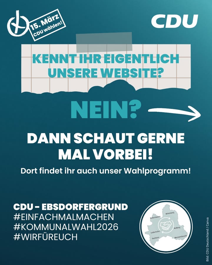 mehr‼️Jetzt ist Zeit, Verantwortung zu übernehmen.Unser Ebsdorfergrund braucht kein Weiter so.Er braucht Mut, Klarheit und Menschen, die anpacken. 💪👉 Auf eure Stimme kommt es an.Am 15.03.2026 CDU ? Ebsdorfergrund wählen!Für vernünftige Entscheidungen!Für solide Finanzen!Für Politik mit Bodenhaftung ? nah bei den Menschen !Wir stehen für Verantwortung. Für Handeln.Für unsere Gemeinde. 🏡👉 Jetzt ist der Moment da:Einfach mal machen. Gemeinsam mit euch!#VerantwortungÜbernehmen #KeinWeiterSo #CDUEbsdorfergrund #ZukunftGestalten #Kommunalwahl2026 #Ebsdorfergrund #UnsereHeimat #StarkeListe #FürUnsereGemeinde #Kommunalpolitik #PolitikVorOrt #NahBeiDenMenschen #ZuhörenAnpackenDranbleiben #GemeinsamStark #MitHerzUndVerantwortung #Zusammenhalt #ZukunftGestalten #CDUEbsdorfergrund