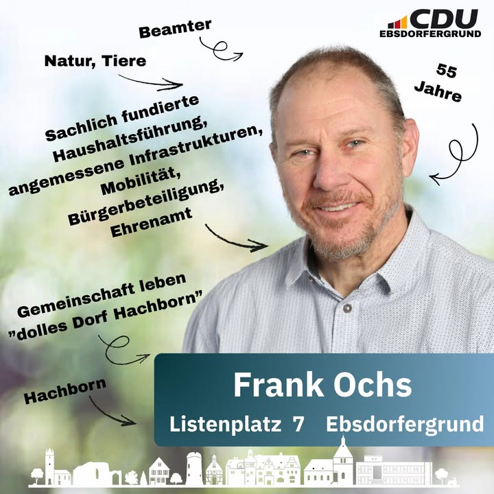 👋 Wir stellen vor!Unseren Kandidaten, Listenplatz 7: Frank OchsFrank Ochs kandidiert parteilos für die CDU Ebsdorfergrund bei der Kommunalwahl 2026.Als Beamter bringt Frank Ochs Erfahrung, Sachverstand und einen klaren Blick für die Herausforderungen unserer Gemeinde mit.🏡 Verwurzelt im Ebsdorfergrund:Aus Hachborn, Ortsvorsteher von Hachborn. 🎯 Schwerpunkte:? die Interessen und Anliegen aller Bürgerinnen und Bürger vertreten? für eine gute gemeinsame Zukunft? politisch unabhängig? Gemeinschaft leben, "dolles Dorf Hachborn"Frank Ochs steht für eine verlässliche, bürgernahe Kommunalpolitik und möchte die Zukunft des Ebsdorfergrundes aktiv mitgestalten.👉 Gemeinsam den Ebsdorfergrund gestalten!#UnsereKandidaten #CDUEbsdorfergrund #StarkeListe #Kommunalwahl2026 #UnserEbsdorfergrund #GemeinsamGestalten #FürUnsereGemeinde #DeineStimmeZählt #KeinWeiterSo #VerantwortungÜbernehmen #CDU #CDUEbsdorfergrund #VorOrtEntscheiden #Ebsdorfergrund #UnsereHeimat #StarkeListe #FürUnsereGemeinde #Kommunalpolitik #PolitikVorOrt #NahBeiDenMenschen #ZuhörenAnpackenDranbleiben #GemeinsamStark #MitHerzUndVerantwortung #Zusammenhalt #ZukunftGestalten