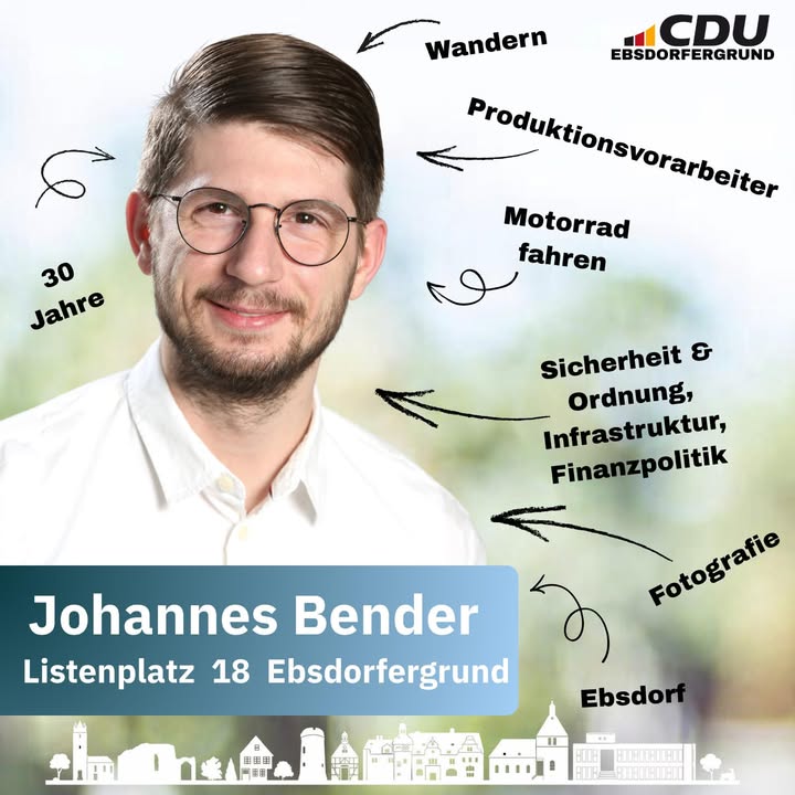 👋 Wir stellen vor: Johannes Bender, Listenplatz 18Johannes Bender ist Produktionsvorarbeiter und fest im Ebsdorfergrund verwurzelt.In seiner Freizeit findet man ihn beim Wandern, Motorradfahren, Fotografieren oder im Austausch mit Freunden ? bodenständig, aktiv und nah bei den Menschen.🤝 Verantwortung übernehmen, wo man lebt.🚧 Für Johannes stehen Sicherheit & Ordnung, eine funktionierende Infrastruktur und eine solide Finanzpolitik im Mittelpunkt.💛 Dafür setzt er sich ein:? Verantwortungsvolle Finanzpolitik? Erhalt unserer Dorfstrukturen? Sicherheit, Ordnung & VerlässlichkeitAus Überzeugung kandidiert Johannes Bender für die CDU Ebsdorfergrund.Das langjährige Engagement seines Vaters in der CDU war für ihn Vorbild und Motivation, selbst Verantwortung zu übernehmen ? für pragmatische Entscheidungen mit gesundem Menschenverstand.👉 Gemeinsam unseren Ebsdorfergrund zukunftssicher gestalten!Am 15. März CDU - Ebsdorfergrund wählen!#UnsereKandidaten #CDUEbsdorfergrund #StarkeListe #Kommunalwahl2026 #UnserEbsdorfergrund #GemeinsamGestalten #FürUnsereGemeinde #DeineStimmeZählt #KeinWeiterSo #VerantwortungÜbernehmen #CDU #CDUEbsdorfergrund #VorOrtEntscheiden #Ebsdorfergrund #UnsereHeimat #StarkeListe #FürUnsereGemeinde #Kommunalpolitik #PolitikVorOrt #NahBeiDenMenschen #ZuhörenAnpackenDranbleiben #GemeinsamStark #MitHerzUndVerantwortung #Zusammenhalt #ZukunftGestalten