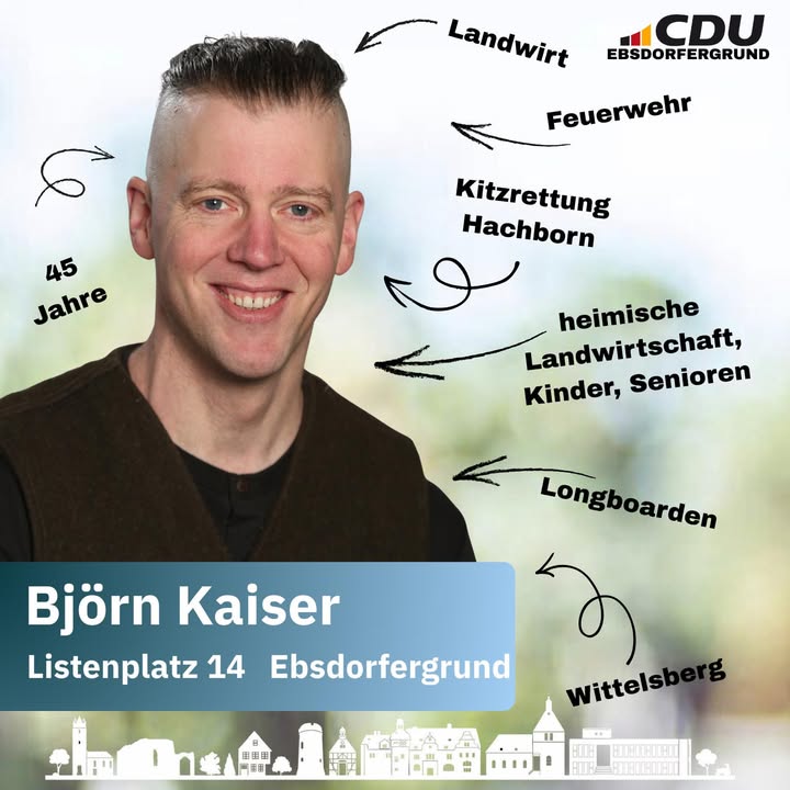 🌟 Wir stellen vor: Björn Kaiser 🗳️ Listenplatz 14🏡 Björn Kaiser lebt in Wittelsberg und ist Landwirt 🌾. Er kennt die Herausforderungen und Chancen der heimischen Landwirtschaft aus erster Hand und möchte ihre Stimme in der Kommunalpolitik vertreten.🚒 Neben seiner beruflichen Tätigkeit engagiert er sich aktiv in der Feuerwehr und ist ehrenamtlich bei der Kitzrettung Hachborn e. V. (Wildtierrettung) 🦌 tätig.In seiner Freizeit fährt er gerne Longboard oder Fahrrad 🚴♂️🛹.🏘Politisch setzt er sich für eine lebenswerte Gemeinde für alle Generationen ein. Besonders liegen ihm die heimische Landwirtschaft, die Förderung von Kindern und Jugendlichen sowie die Unterstützung älterer Menschen am Herzen ❤. Björn Kaiser möchte mitgestalten, damit der Ebsdorfergrund ein Ort bleibt, in dem Menschen gerne leben, arbeiten und aufwachsen.📣 Björn Kaiser kandidiert auf der Liste der CDU Ebsdorfergrund, weil für ihn gilt: "Demokratie braucht Einsatz!" 💪 Für ihn bedeutet das, aktiv Verantwortung zu übernehmen und die Interessen der Bürgerinnen und Bürger sichtbar in die Politik einzubringen.👉 Für einen starken Ebsdorfergrund im Einklang mit Natur und Zukunft!Am 15. März 2026 Liste 1, CDU - Ebsdorfergrund wählen!#UnsereKandidaten #CDUEbsdorfergrund #StarkeListe #Kommunalwahl2026 #UnserEbsdorfergrund #GemeinsamGestalten #FürUnsereGemeinde #DeineStimmeZählt #KeinWeiterSo #VerantwortungÜbernehmen #CDU #CDUEbsdorfergrund #VorOrtEntscheiden #Ebsdorfergrund #UnsereHeimat #StarkeListe #FürUnsereGemeinde #Kommunalpolitik #PolitikVorOrt #NahBeiDenMenschen #ZuhörenAnpackenDranbleiben #GemeinsamStark #MitHerzUndVerantwortung #Zusammenhalt #ZukunftGestalten