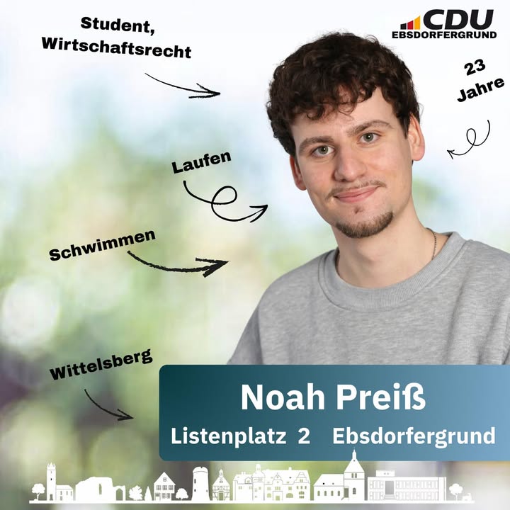🌟Wir stellen vor: Noah Preiß 🌟🗳️ Listenplatz 2🏡 Noah Preiß lebt in Wittelsberg und studiert Wirtschaftsrecht. Er bringt juristisches Verständnis, Verantwortungsbewusstsein und einen klaren Blick für faire Lösungen mit.🏃♂️🏊♂️ In seiner Freizeit ist er sportlich aktiv, geht gerne laufen und schwimmen ? Ausgleich, Disziplin und Durchhaltevermögen gehören für ihn ganz selbstverständlich dazu.🤝 Besonders am Herzen liegen ihm ein respektvoller Umgang miteinander sowie die klare Wertschätzung des Ehrenamtes.Für Noah Preiß sind genau diese Werte das Fundament einer starken Gemeinschaft und der Zusammenhalt, der unsere Gemeinde lebendig und zusammen hält. Gemeinsam unseren Ebsdorfergrund zukunftssicher gestalten!Am 15. März CDU - Ebsdorfergrund wählen!#UnsereKandidaten #CDUEbsdorfergrund #StarkeListe #Kommunalwahl2026 #UnserEbsdorfergrund #GemeinsamGestalten #FürUnsereGemeinde #DeineStimmeZählt #KeinWeiterSo #VerantwortungÜbernehmen #CDU #CDUEbsdorfergrund #VorOrtEntscheiden #Ebsdorfergrund #UnsereHeimat #StarkeListe #FürUnsereGemeinde #Kommunalpolitik #PolitikVorOrt #NahBeiDenMenschen #ZuhörenAnpackenDranbleiben #GemeinsamStark #MitHerzUndVerantwortung #Zusammenhalt #ZukunftGestalten