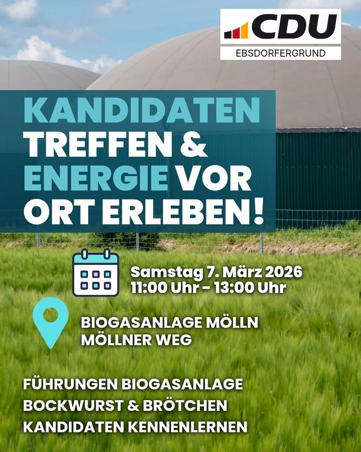 mehrBürgerdialog & Energie hautnah erleben!Am kommenden Samstag, 07. März 2026, laden wir alle Bürgerinnen und Bürger herzlich ein, bei einem besonderen Treffen vor Ort in Heskem?Mölln dabei zu sein! Nutzen Sie die Gelegenheit, unsere Kandidaten persönlich kennenzulernen, Ihre Fragen zu stellen und direkt ins Gespräch zu kommen.Neben dem Dialog erwartet Sie ein spannender Einblick in die Biogasanlage der Biogas Ebsdorfergrund GmbH & Co. KG. Erfahren Sie, wie aus organischen Rohstoffen erneuerbare Energie erzeugt wird, die Strom und Wärme für die Region liefert ? ein lebendiges Beispiel für nachhaltige Energieproduktion vor unserer Haustür.Für das leibliche Wohl ist selbstverständlich gesorgt: Es gibt Bockwürstchen mit frischen Brötchen und warme sowie kühle Getränke, sodass ein informativer Besuch auch richtig gemütlich wird.📍 Ort: Biogasanlage Heskem?Mölln, Ebsdorfergrund⏰ Zeit: Jetzt am kommenden Samstag den 07. März 2026, ab 11:00 Uhr bis 13:00 Uhr.Kommen Sie vorbei, erleben Sie die Energie von morgen und tauschen Sie sich direkt mit unseren Kandidaten aus ? wir freuen uns auf Sie!Gemeinsam unseren Ebsdorfergrund zukunftssicher gestalten!Am 15. März CDU - Ebsdorfergrund wählen!#UnsereKandidaten #CDUEbsdorfergrund #StarkeListe #Energie #Kommunalwahl2026 #UnserEbsdorfergrund #GemeinsamGestalten #FürUnsereGemeinde #DeineStimmeZählt #KeinWeiterSo #VerantwortungÜbernehmen #CDU #CDUEbsdorfergrund #VorOrtEntscheiden #Ebsdorfergrund #UnsereHeimat #StarkeListe #FürUnsereGemeinde #Kommunalpolitik #PolitikVorOrt #NahBeiDenMenschen #ZuhörenAnpackenDranbleiben #GemeinsamStark #MitHerzUndVerantwortung #Zusammenhalt #ZukunftGestalten