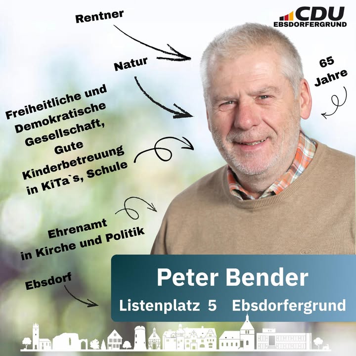 🌟 Wir stellen vor: Peter Bender 🌟🗳 Listenplatz 5🏡 Peter Bender lebt in Ebsdorf und ist gerne in der Natur unterwegs 🌳.🤝 Ehrenamt in Kirche und Politik liegen ihm besonders am Herzen. Er setzt sich für eine freiheitliche Gesellschaft ein und möchte die Kinderbetreuung in KiTa, Schule sowie später im Ausbildungs- und Berufsleben nachhaltig stärken 👶🏫.📌 Für Peter Bender steht Kontinuität, Verlässlichkeit und sachorientiertes Handeln im Vordergrund. Er engagiert sich für eine Politik, die realistische Ziele verfolgt und unsere Gemeinde langfristig stärkt 🏘.⚖️ Peter Bender betont: Die einzige Partei, die nicht polarisiert und keine unerfüllbaren Versprechen macht, verfolgt eine langfristige, verlässliche Politik. Während andere Parteien in den letzten Jahrzehnten teilweise ihre Wahlziele nicht umgesetzt haben, setzt Peter auf bewährte Lösungen: So hat die CDU z. B. 1993 mit der Zählgemeinschaft die Konsolidierung der Finanzen im Ebsdorfergrund entscheidend vorangebracht 💼. Gemeinsam unseren Ebsdorfergrund zukunftssicher gestalten!Am 15. März CDU - Ebsdorfergrund wählen!#UnsereKandidaten #CDUEbsdorfergrund #StarkeListe #Kommunalwahl2026 #UnserEbsdorfergrund #GemeinsamGestalten #FürUnsereGemeinde #DeineStimmeZählt #KeinWeiterSo #VerantwortungÜbernehmen #CDU #CDUEbsdorfergrund #VorOrtEntscheiden #Ebsdorfergrund #UnsereHeimat #StarkeListe #FürUnsereGemeinde #Kommunalpolitik #PolitikVorOrt #NahBeiDenMenschen #ZuhörenAnpackenDranbleiben #GemeinsamStark #MitHerzUndVerantwortung #Zusammenhalt #ZukunftGestalten