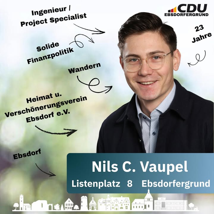 mehr🌟Wir stellen vor: Noah Preiß 🌟🗳️ Listenplatz 2🏡 Noah Preiß lebt in Wittelsberg und studiert Wirtschaftsrecht. Er bringt juristisches Verständnis, Verantwortungsbewusstsein und einen klaren Blick für faire Lösungen mit.🏃♂️🏊♂️ In seiner Freizeit ist er sportlich aktiv, geht gerne laufen und schwimmen ? Ausgleich, Disziplin und Durchhaltevermögen gehören für ihn ganz selbstverständlich dazu.🤝 Besonders am Herzen liegen ihm ein respektvoller Umgang miteinander sowie die klare Wertschätzung des Ehrenamtes.Für Noah Preiß sind genau diese Werte das Fundament einer starken Gemeinschaft und der Zusammenhalt, der unsere Gemeinde lebendig und zusammen hält. Gemeinsam unseren Ebsdorfergrund zukunftssicher gestalten!Am 15. März CDU - Ebsdorfergrund wählen!#UnsereKandidaten #CDUEbsdorfergrund #StarkeListe #Kommunalwahl2026 #UnserEbsdorfergrund #GemeinsamGestalten #FürUnsereGemeinde #DeineStimmeZählt #KeinWeiterSo #VerantwortungÜbernehmen #CDU #CDUEbsdorfergrund #VorOrtEntscheiden #Ebsdorfergrund #UnsereHeimat #StarkeListe #FürUnsereGemeinde #Kommunalpolitik #PolitikVorOrt #NahBeiDenMenschen #ZuhörenAnpackenDranbleiben #GemeinsamStark #MitHerzUndVerantwortung #Zusammenhalt #ZukunftGestalten