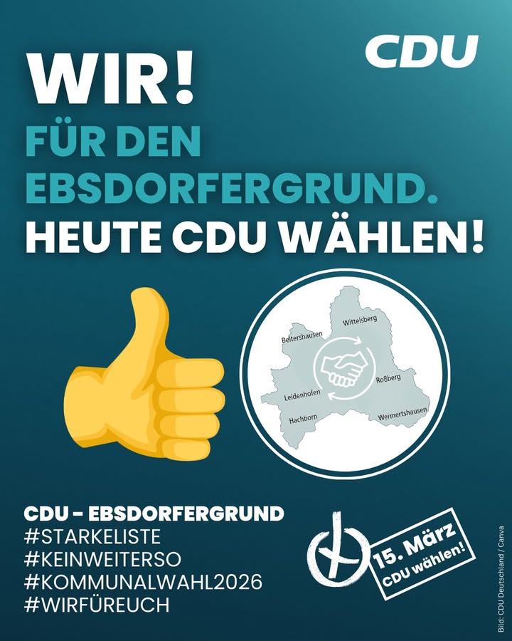 mehr🗳 Morgen entscheidet sich die Zukunft unseres Ebsdorfergrunds.Kommunalpolitik ist mehr als Programme und Versprechen.Es geht um unsere Familien, unsere Sicherheit, unsere Vereine und unser Zuhause.Wir als CDU Ebsdorfergrund stehen für eine Politik, die anpackt ? bürgernah, verantwortungsvoll und mit klarem Blick auf das, was unsere Gemeinde wirklich braucht.Darum bitten wir Sie morgen um Ihr Vertrauen.5 Gründe für die CDU Ebsdorfergrund:👨👩👧 Familien im MittelpunktVerlässliche Kinderbetreuung, starke Kitas und Unterstützung für Familien.🚒 Feuerwehr stärkenKlare Entscheidungen für unsere Feuerwehr und echte Unterstützung für das Ehrenamt.🏡 Maßvolle Entwicklung unserer GemeindeBoden ist endlich ? wir stehen für nachhaltige und verantwortungsvolle Baupolitik.💰 Ehrliche FinanzpolitikPflichtaufgaben wie Feuerwehr, Kitas und Infrastruktur haben für uns Priorität.🤝 Politik auf AugenhöheMit den Menschen sprechen ? nicht über sie entscheiden.🤝Ebsdorfergrund ist unsere Heimat.Und wir möchten, dass unsere Gemeinde auch in Zukunft lebenswert, sicher und familienfreundlich bleibt.👉 Gehen Sie morgen wählen.👉 Geben Sie der CDU Ebsdorfergrund Ihre Stimme.#Ebsdorfergrund #UnsereHeimat #UnsereListe #FürUnsereGemeinde #Kommunalpolitik #PolitikVorOrt #NahBeiDenMenschen #ZuhörenAnpackenDranbleiben #GemeinsamStark #MitHerzUndVerantwortung #Zusammenhalt #ZukunftGestalten #CDUEbsdorfergrund #Kommunalwahl2026