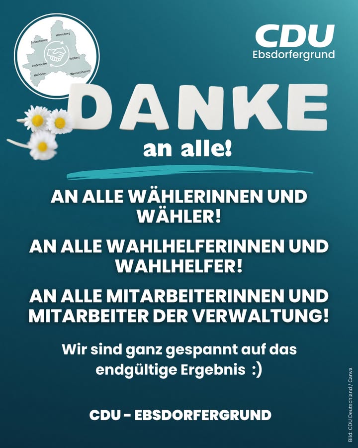 mehr🗳 Vielen Dank an alle !Der gestrige Sonntag hat einmal mehr gezeigt, wie wichtig das Engagement vieler Menschen für unsere Demokratie ist. Ein Wahltag funktioniert nur, weil zahlreiche Bürgerinnen und Bürger bereit sind, Verantwortung zu übernehmen und sich einzubringen.👏 Ein besonderer Dank geht daher an alle Bürgerinnen und Bürger, die von ihrem Wahlrecht Gebrauch gemacht haben. Jede abgegebene Stimme ist ein Zeichen dafür, dass unsere Demokratie lebt und getragen wird.🙏 Ein großes Dankeschön gilt auch allen Wahlhelferinnen und Wahlhelfern, die in den Wahllokalen im Einsatz waren. Mit viel Verantwortungsbewusstsein haben sie dafür gesorgt, dass die Abstimmung ordnungsgemäß und fair durchgeführt werden konnte.Ebenso möchten wir uns bei den Mitarbeiterinnen und Mitarbeitern der Gemeindeverwaltung bedanken, die auch in den kommenden Tagen noch mit der Auszählung und Aufarbeitung der Stimmen beschäftigt sind. Diese Arbeit geschieht oft im Hintergrund ? ist aber ein entscheidender Teil eines funktionierenden demokratischen Prozesses.Jetzt blicken wir gespannt auf das endgültige Ergebnis.Eure CDU ? Ebsdorfergrund.#Kommunalwahl2026 #Demokratie #Danke #Ehrenamt #Ebsdorfergrund #UnsereHeimat #UnsereListe #FürUnsereGemeinde #Kommunalpolitik #PolitikVorOrt #NahBeiDenMenschen #ZuhörenAnpackenDranbleiben #GemeinsamStark #MitHerzUndVerantwortung #Zusammenhalt #ZukunftGestalten