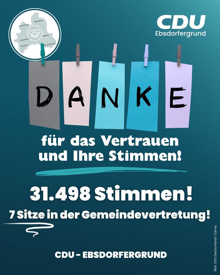 Liebe Bürgerinnen und Bürger im Ebsdorfergrund,wir als CDU Ebsdorfergrund sagen von Herzen: Danke für Ihr Vertrauen! 🙏Die Kommunalwahl 2026 zeigt: Unsere Arbeit wird gesehen und anerkannt. Auch wenn wir uns natürlich noch ein etwas besseres Ergebnis gewünscht hätten, sind wir mit diesem klaren Zugewinn zufrieden und dankbar.☑ Stimmenzuwachs von 22.537 auf 31.498 Stimmen☑ Steigerung von 18,88 % auf 23,04 %☑ Gewinn eines weiteren Sitzes ? jetzt 7 Sitze in der GemeindevertretungDas ist ein starkes Signal für unsere Politik im Ebsdorfergrund und Ansporn, den eingeschlagenen Weg konsequent weiterzugehen.Besonders erfreulich ist auch die gestiegene Wahlbeteiligung:Von 57,55 % (2021) auf 64,69 % (2026) ? ein wichtiges Zeichen für eine lebendige Demokratie! 🗳️Die Kräfteverhältnisse haben sich verändert!Unser Anspruch bleibt:👉 Verlässlich👉 Bürgernah👉 ZukunftsorientiertVielen Dank an alle Wählerinnen und Wähler sowie an alle Unterstützerinnen und Unterstützer!Ihre CDU Ebsdorfergrund
